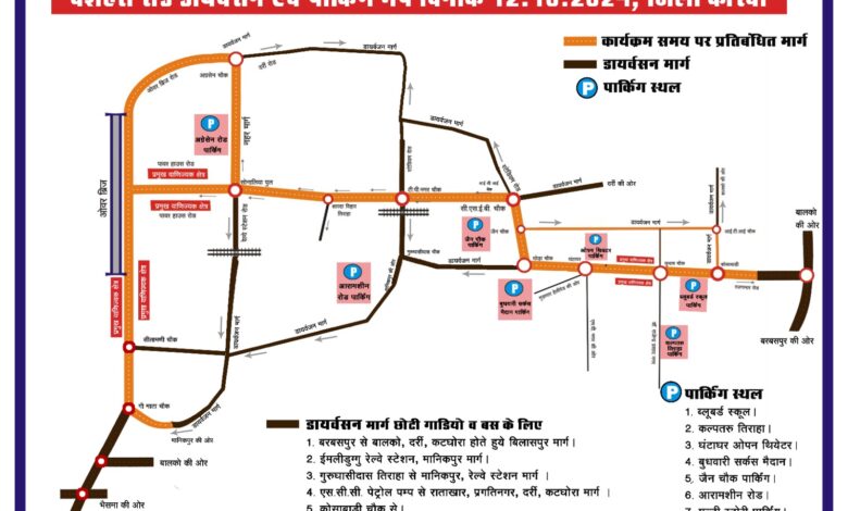 पुलिस ने एक विशेष मैप जारी किया है जिसमें बताया गया है कि बड़े वाहनों का सुबह 5 बजे से लेकर रात 12 बजे तक आना प्रतिबंधित रहेगा। इसके अलावा, पार्किंग के लिए निम्नलिखित स्थल निर्धारित किए गए हैं: